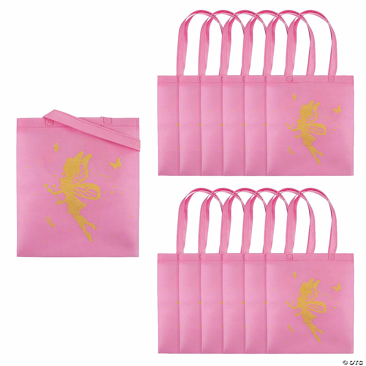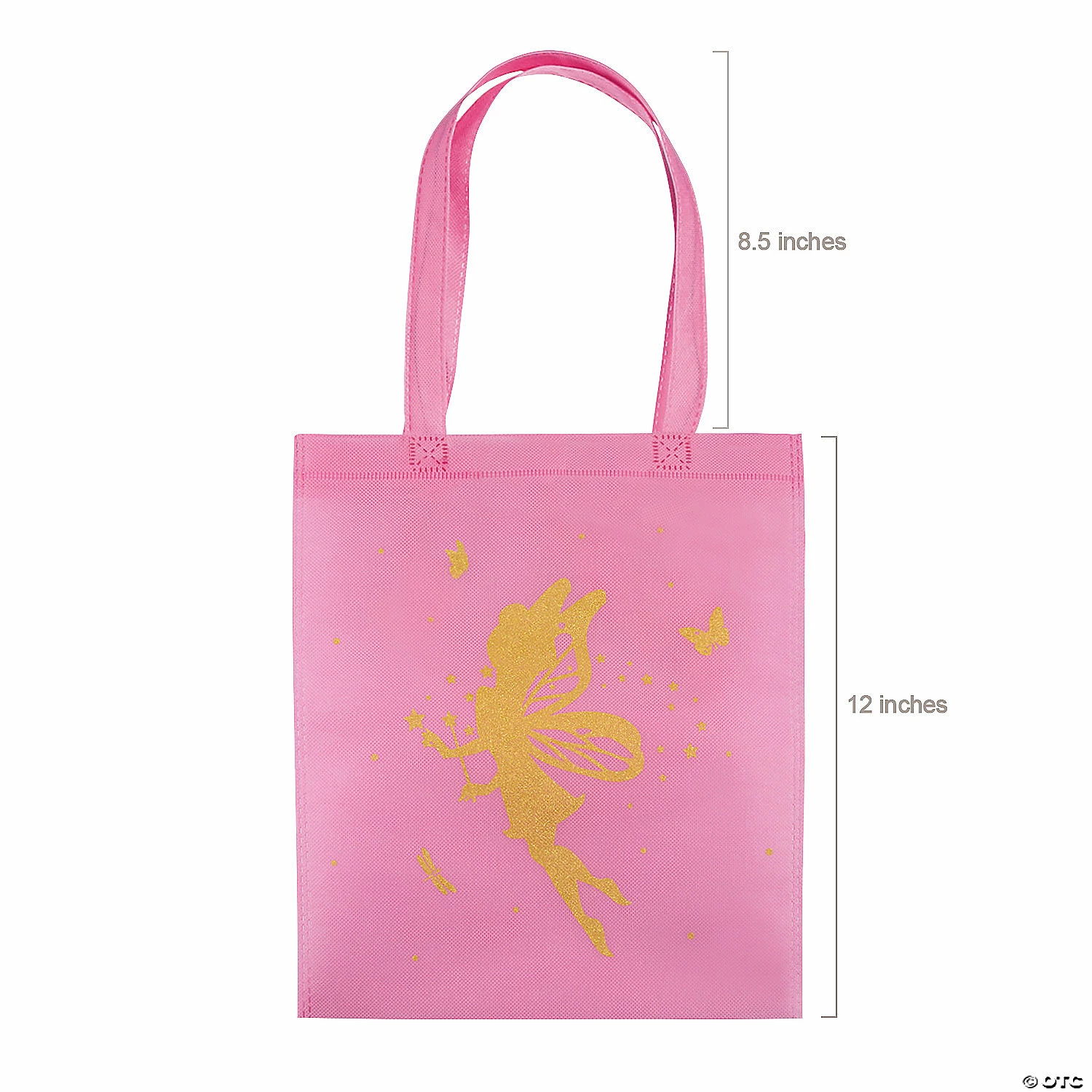 β’ Multi-purpose: These bags can carry a wide range of everyday essentials, including books, toys, groceries, snacks, sunglasses, and more! Bring it along with you on special outings to the beach, the farmerβs market, or even the store. Youβll be glad you did! β’ Durable Quality: These sturdy tote bags wonβt let you or your accessories down. Plus, you can easily store the reusable bag away until you need it again. β’ Eco-Friendly: Ditch the plastic bags and go green with this eco-friendly tote bag! Mother Earth is sure to appreciate the gesture, so go ahead and gift this tote bag to your friends and family while youβre at it! Product Description:These totes bags are glittery and magical! Featuring a gold glitter fairy on a pink background, these pretty totes are totes perfect for holding party favors or gifts. Reuse them again and again to carry school supplies, craft supplies or snacks! Nonwoven polypropylene. Β© OTCSize: 10″ x 12″Quantity: 12Material: Nonwoven polypropylene.