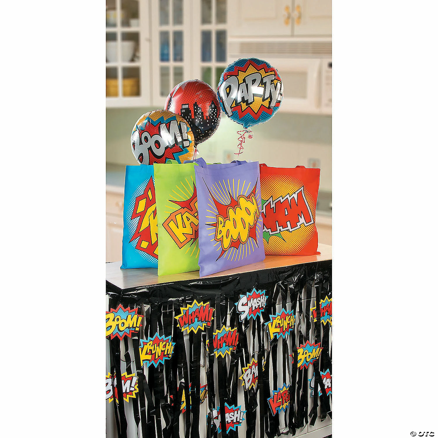 โข Multi-purpose: This tote bag can carry a wide range of everyday essentials, including books, superhero gadgets, groceries, snacks, sunglasses, and more! Bring it along with you on special outings to the beach, the farmerโs market, or even the store. Youโll be glad you did! โข Durable Quality: Made of nonwoven polypropylene, this sturdy tote bag wonโt let you or your accessories down. Plus, you can easily store the reusable bag away until you need it again. โข Eco-friendly: Ditch the plastic bags and go green with this eco-friendly tote bag! Mother Earth is sure to appreciate the heroic gesture, so go ahead and gift this tote bag to your friends and family while youโre at it! Product Description: Ready-to-go-go-go superhero tote bags are sure to be everyone’s favorite sidekick no matter where their adventures take them: from field trips, to summer vacations, to picnics and pool days. Whether for a birthday party or a superhero corporate event, these multi-purpose bags sport fun, galvanizing words like, “Boom” and “Kapow” and are tough enough to take on dastardly cartoon villains–not to mention normal wear and tear. Nonwoven polypropylene. 15″ x 17″ with 11 1/2″ handles. ยฉ OTC Size: 15โ x 17โQuantity: 12Material: Nonwoven Polypropylene.