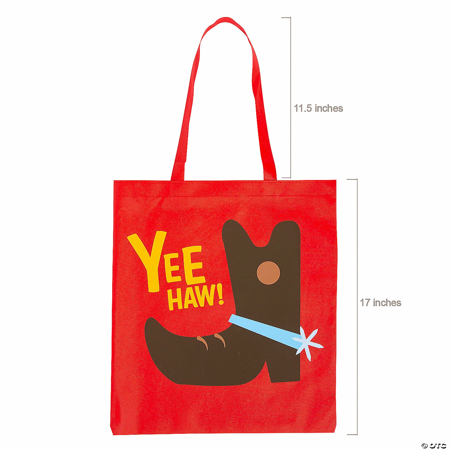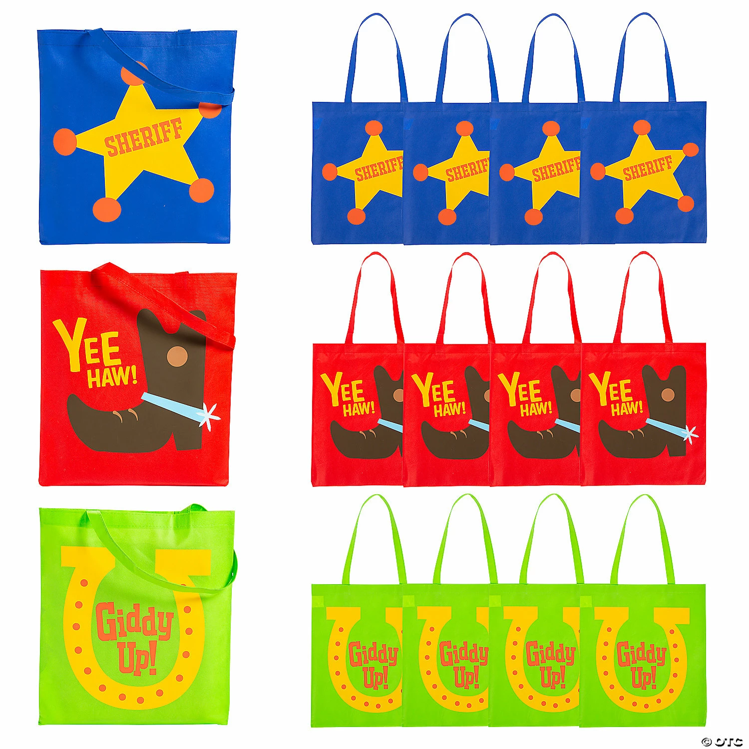 โข Durable Quality: Made of nonwoven polypropylene, this sturdy tote bag wonโt let you or your gear down. Plus, you can easily store the reusable bag away until you need it again. โข Eco-friendly: Ditch the plastic bags and go green with this eco-friendly tote bag! All the folks and critters back home on the range are sure to appreciate the gesture, so go ahead and gift this tote bag to your friends and family while youโre at it! โข Travel-friendly: No matter where your boots take you, this tote bag is sure to be a trusty companion! Designed with easy-to-use straps and a spacious interior compartment, this tote bag is ready for on-the-go fun! Product Description:Yeehaw! Giddy up! Scoop up these tote bags for your Western-themed event or cowboy birthday party for a rootinโ, tootinโ good time! The assortment of Western Tote Bags features symbols like a sheriffโs badge, a boot and spur and a horse shoe on brightly colored bags. Use them as rodeo party favors or Western birthday party giveaways โ just add some cowboy-themed loot! Nonwoven polypropylene. 15″ x 17″ with 11 1/2″ handles. ยฉ OTCSize: 15″ x 17″Quantity: 12Material: Nonwoven Polypropylene.