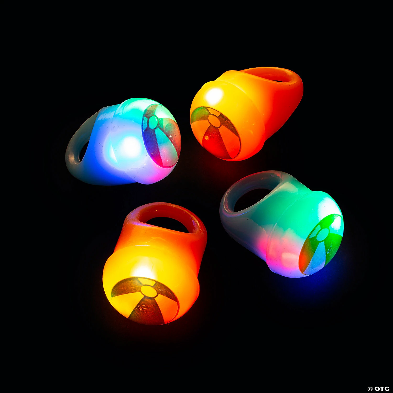 Make your next pool party or beach bash pop with light-up beach ball rings! Kids will have a blast pressing down on the beach balls to activate the colorful, spinning lights inside each ring. They make great birthday party favors, classroom rewards and other prizes. Silicone. 1 1/2″ Includes batteries. ยฉ OTC