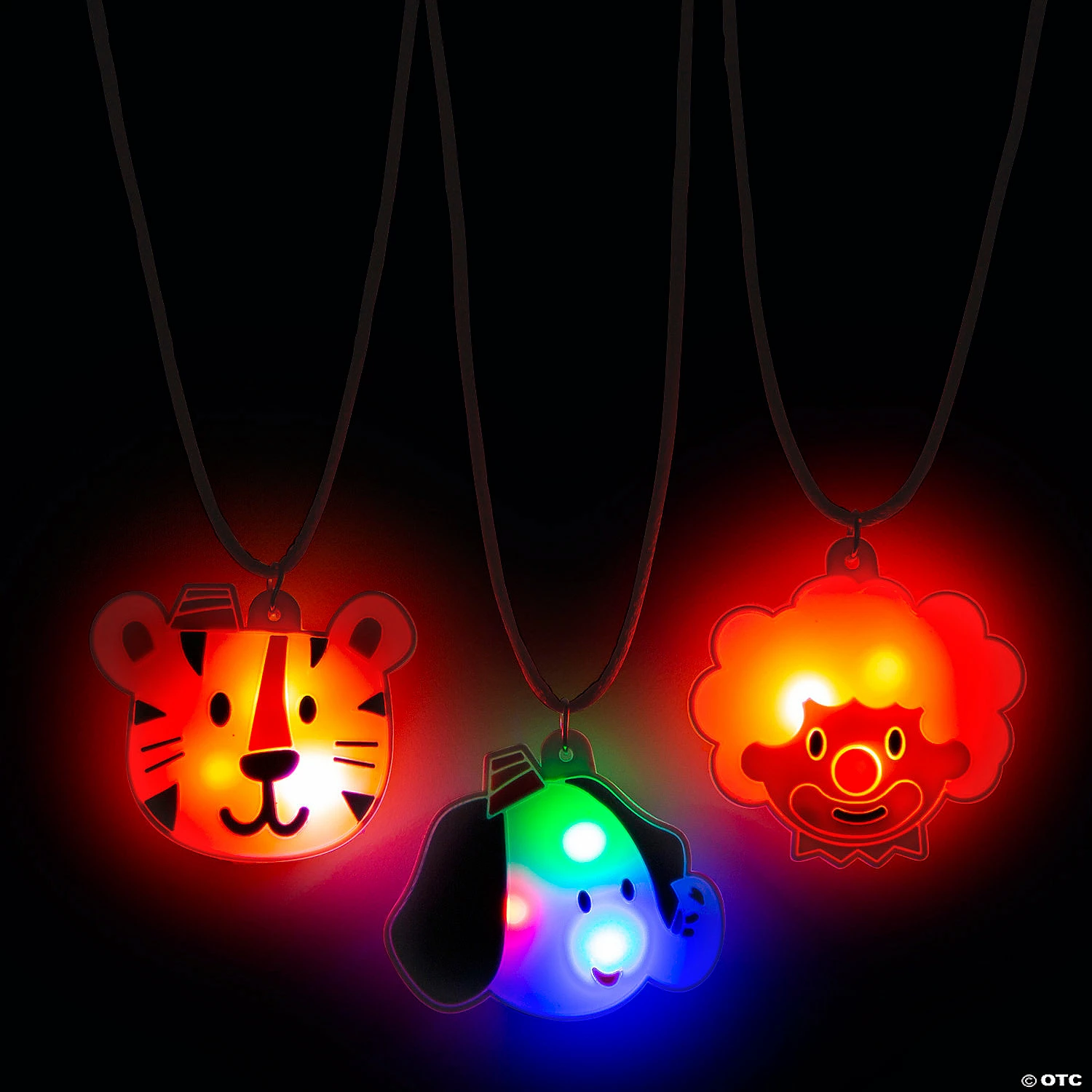 Break out the peanuts and popcorn! These light-up necklaces make perfect carnival prizes, classroom giveaways or even parade throws! Each charm features a different carnival-inspired design like a clown, tiger and elephant and includes 3 different light settings. Each 2″ rubber charm is on a 24″ breakaway cord. Includes batteries.