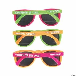 With positive vibes shining so bright, itβs a good thing theyβll have these shades to wear! These kid-sized sunglasses are just the right size for small faces and come in bright colors little ones will love to sport. With ear pieces that feature inspirational notes like, βToday is my dayβ and βKindness is cool,β this eyewear is just right for end-of-year school giveaways, birthday party favors and pool party prizes. For novelty use only. Plastic. 5″ x 1 3/4″ with 4 1/2″ ear pieces. Β© OTC
