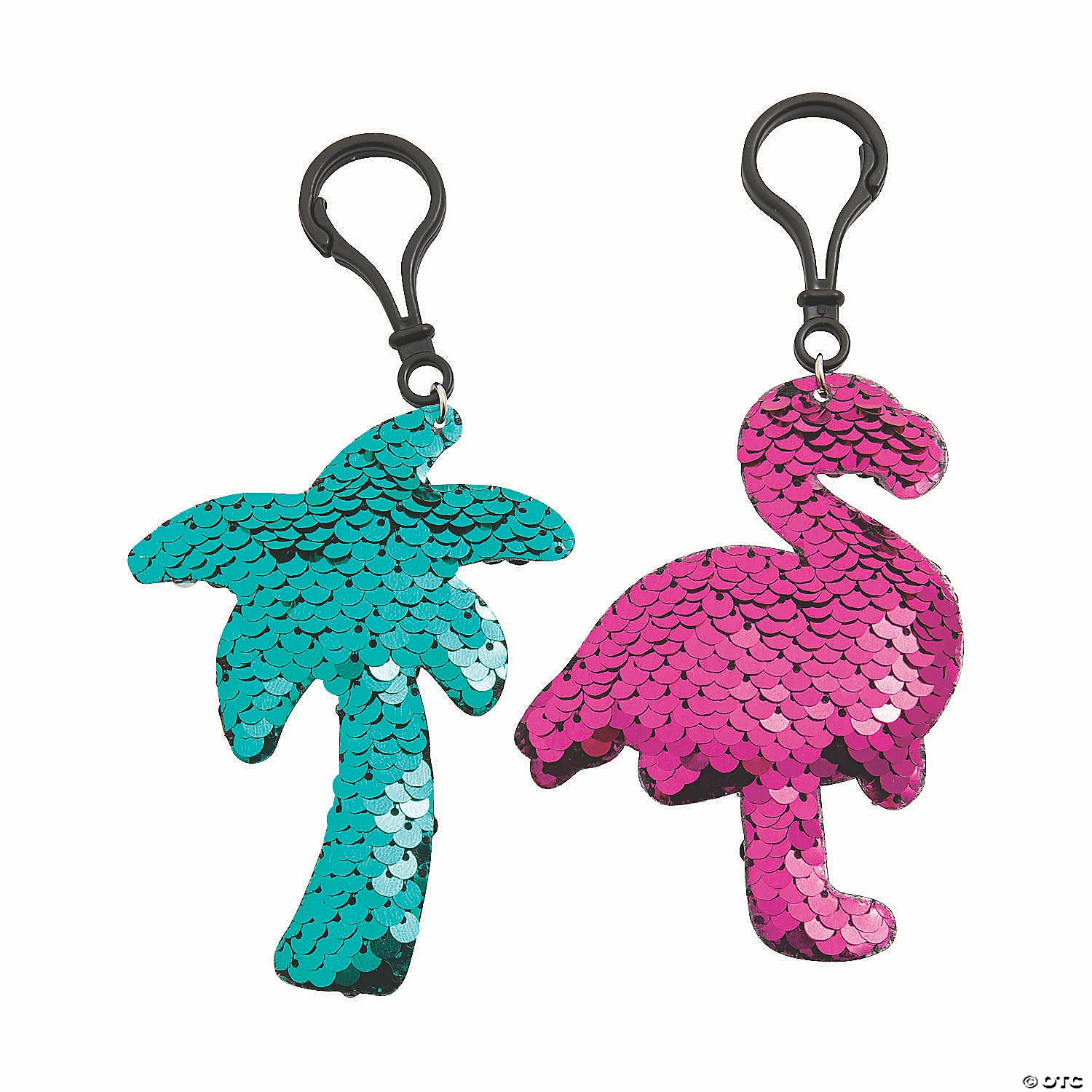 Get your sparkle on with these tropical sequin keychains! This assortment of backpack clips includes shimmering pink flamingo and green palm tree shapes. With simple clips, kids can easily attach the keychains to bags, key rings and pencil pouches for a little extra pizazz. The colored sequins flip up to reveal a silver color โ itโs like magic! Polyester. 4″ with a 2″ plastic clip.