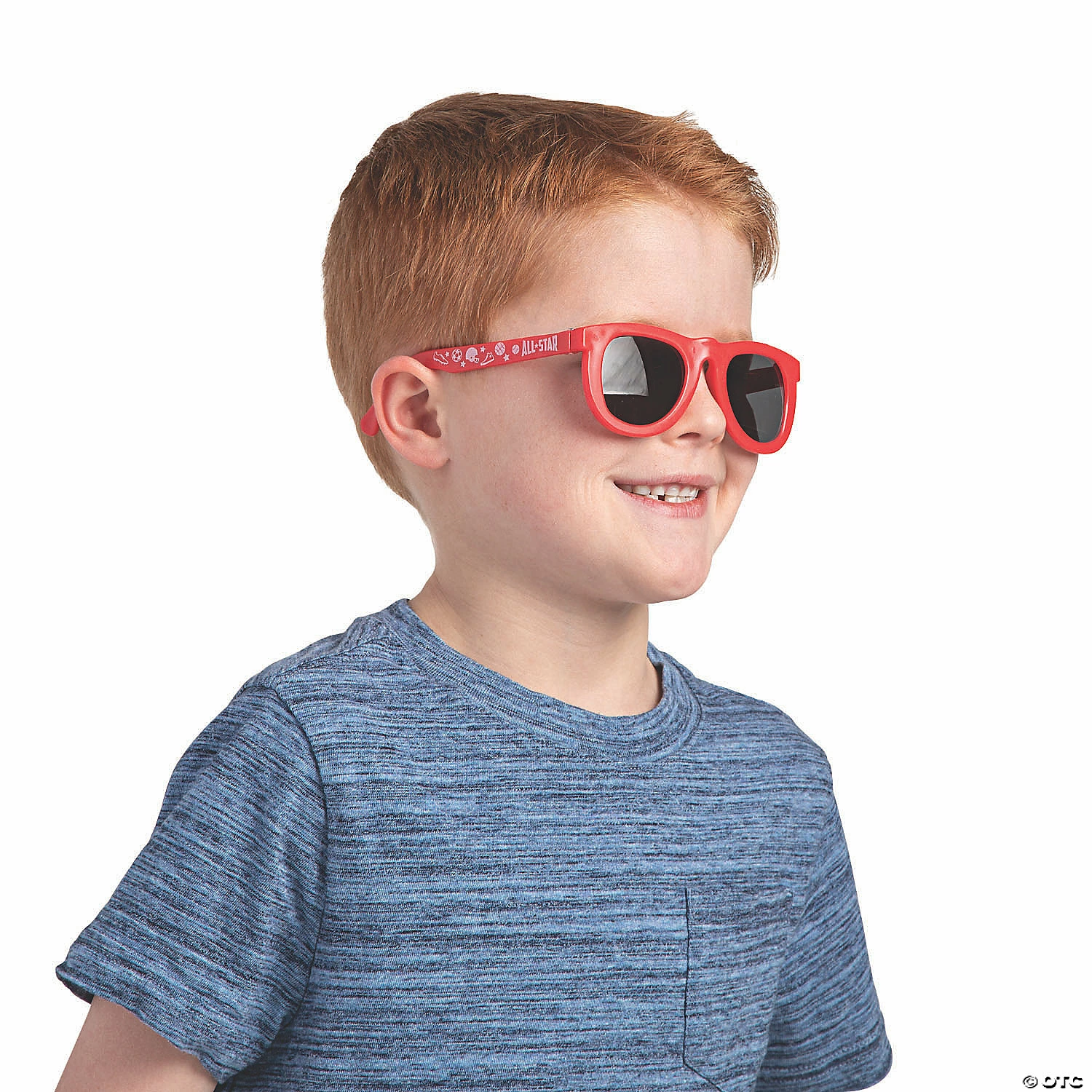 Donβt let the sun get in your all-starβs way! With illustrations of multiple sports on the stems, these colorful, cool shades are the sports-themed birthday party favor or team gift that keeps the sun out of young athletesβ eyes in style, no matter what season it is. They also make a fun last-day-of-school classroom giveaway to celebrate summer. For novelty use only. Plastic. 5″ x 1 3/4″ with 4 1/2″ ear pieces. Β© OTC